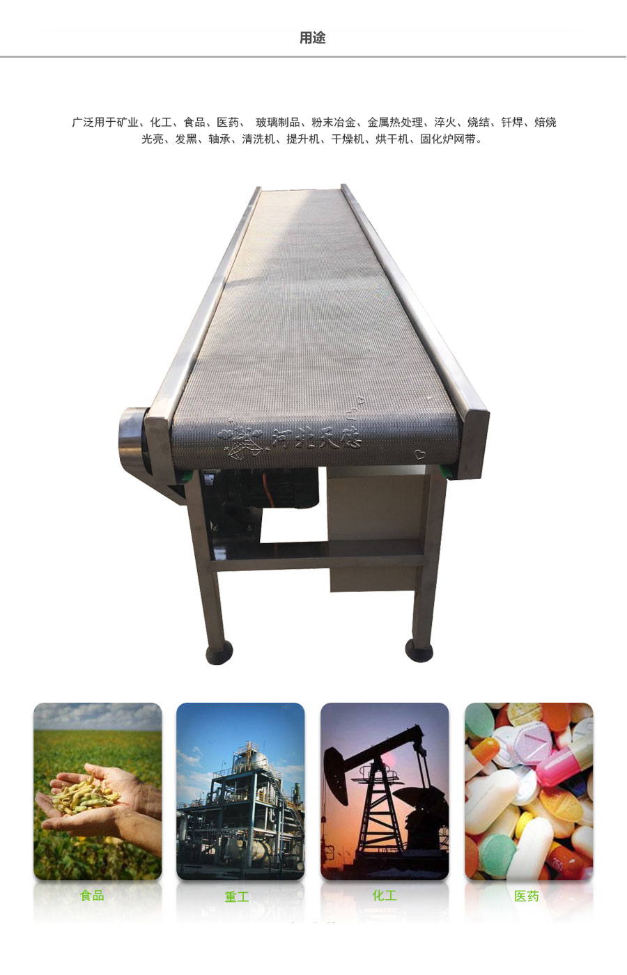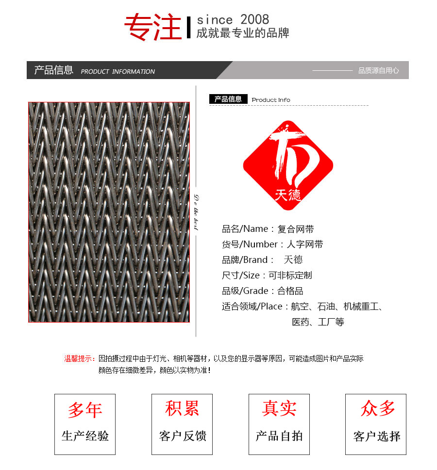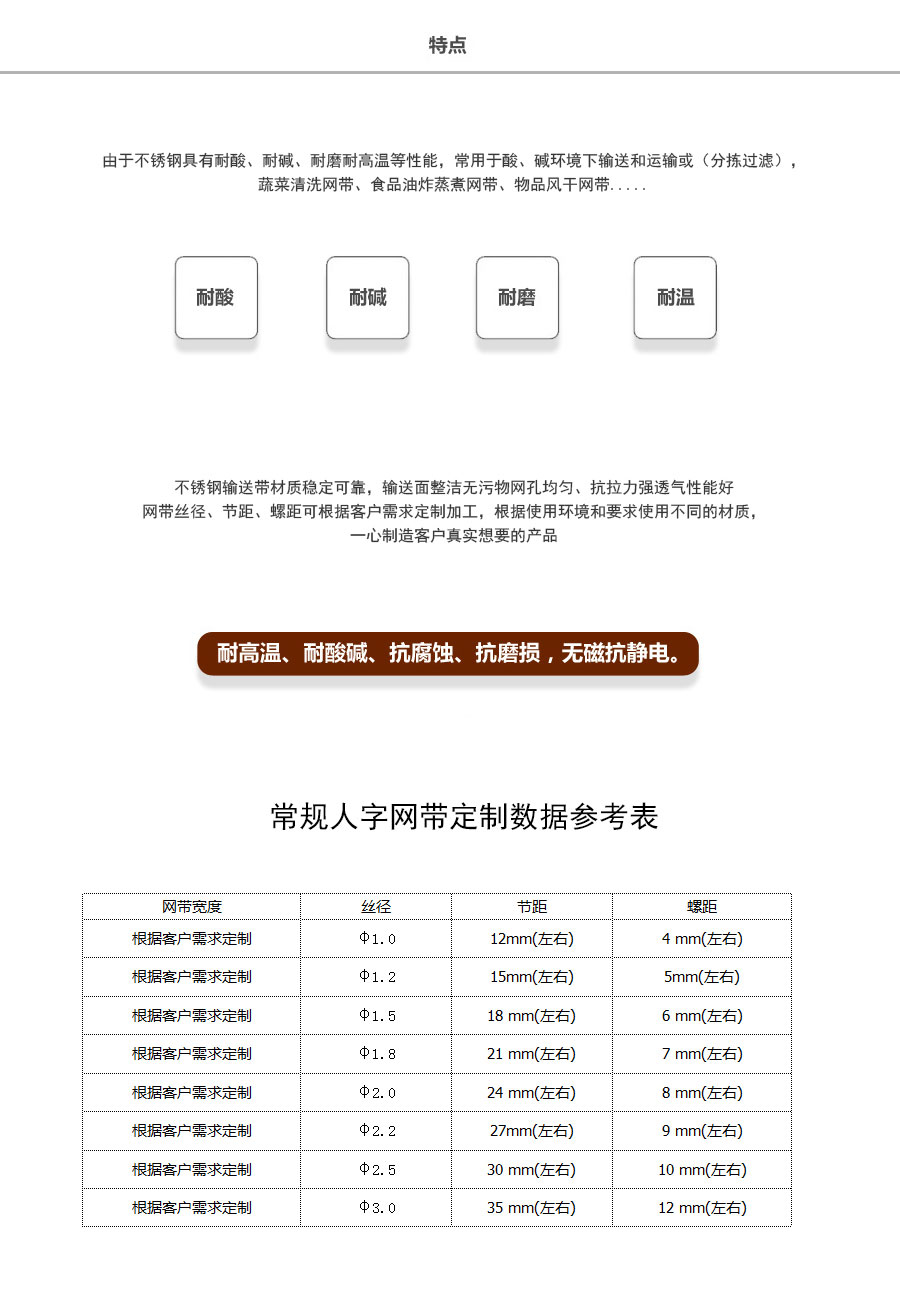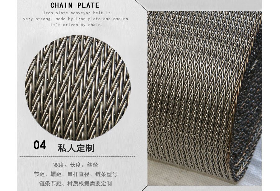 人字形網帶應用:主要應用于食品烘干機、蔬菜、海產品清洗機,巴氏機,方便面米粉蒸煮、熱收縮膜包裝機。玻璃瓶罐、食品、燈炮、金屬、器皿、化纖、印染、醫(yī)藥、電子、粉末冶金、熱處理、木材、物流輸送等各行業(yè)自動裝置和自動流水線的使用;焦爐煤氣及電子紅外線等各種窯爐系統(tǒng)的傳動使用等食品機械,玻璃機械,輸送機械。