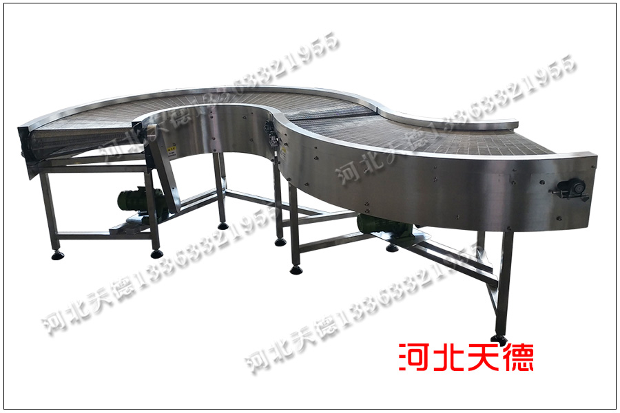遼寧錦州客戶定制的轉彎網帶輸送機,該輸送機是連續轉彎輸送機,用兩臺轉彎角度不同的輸送機拼接而成的。這兩條轉彎輸送機都采用鏈條輸送帶來傳送物品,都是采用不銹鋼材質定制加工的,輸送機的寬度為500毫米,高度為60公分,轉彎角度根據客戶提供來加工的,整機焊點較少,外形漂亮。